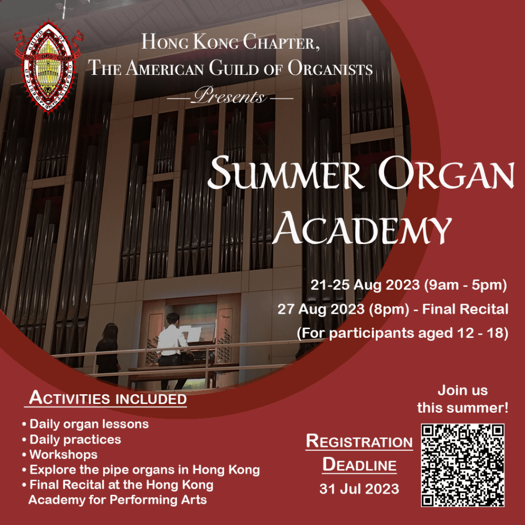 The main campus of the Summer Organ Academy will be held at the chapel of SKH Tang Shiu Kin Secondary School. (6/F, 9 Oi Kwan Road, Wan Chai.) Private lessons and practice sessions in a group of 4 will be held each morning at various locations. Assignment of the group and location will be announced upon the conclusion of the recruitment period.